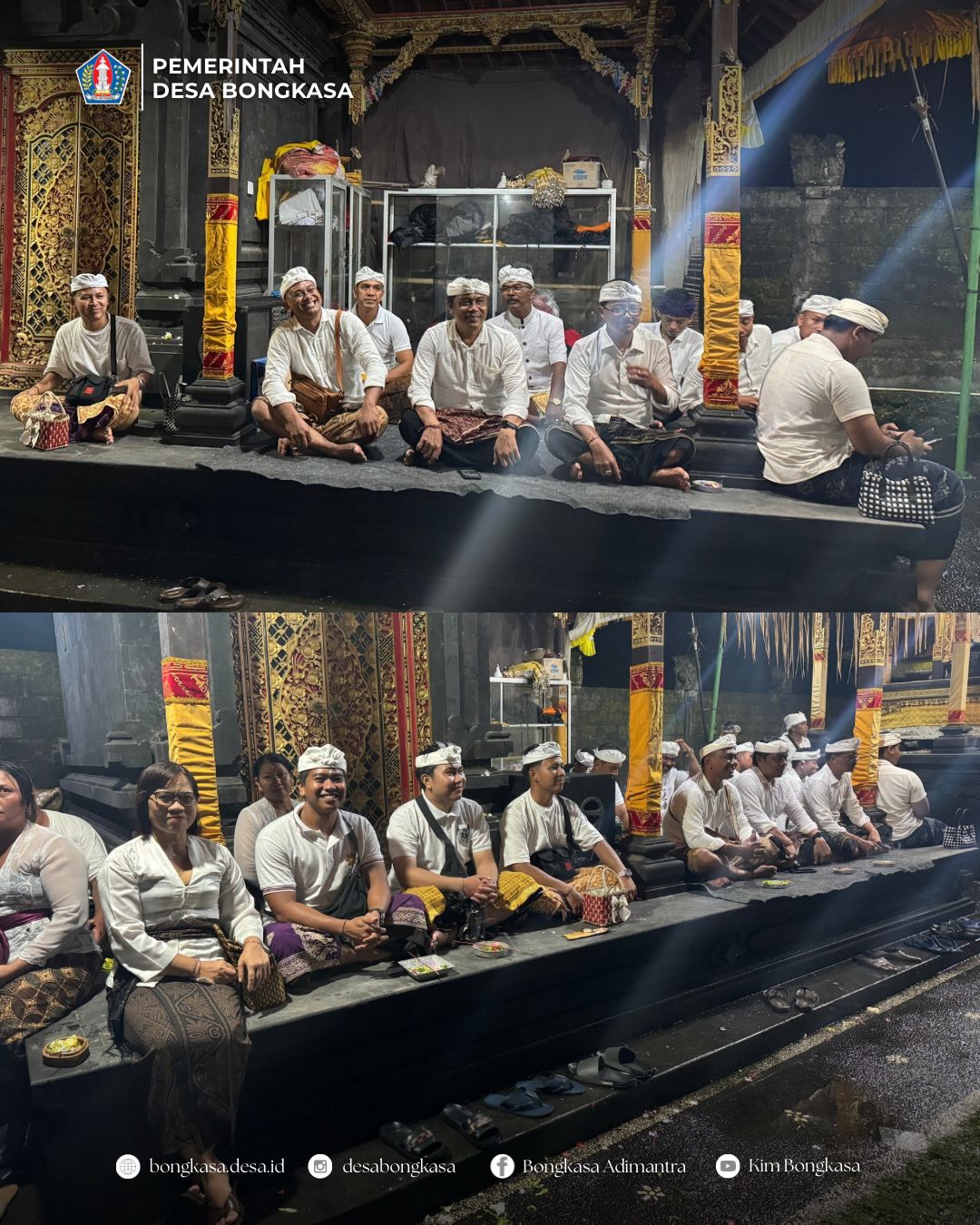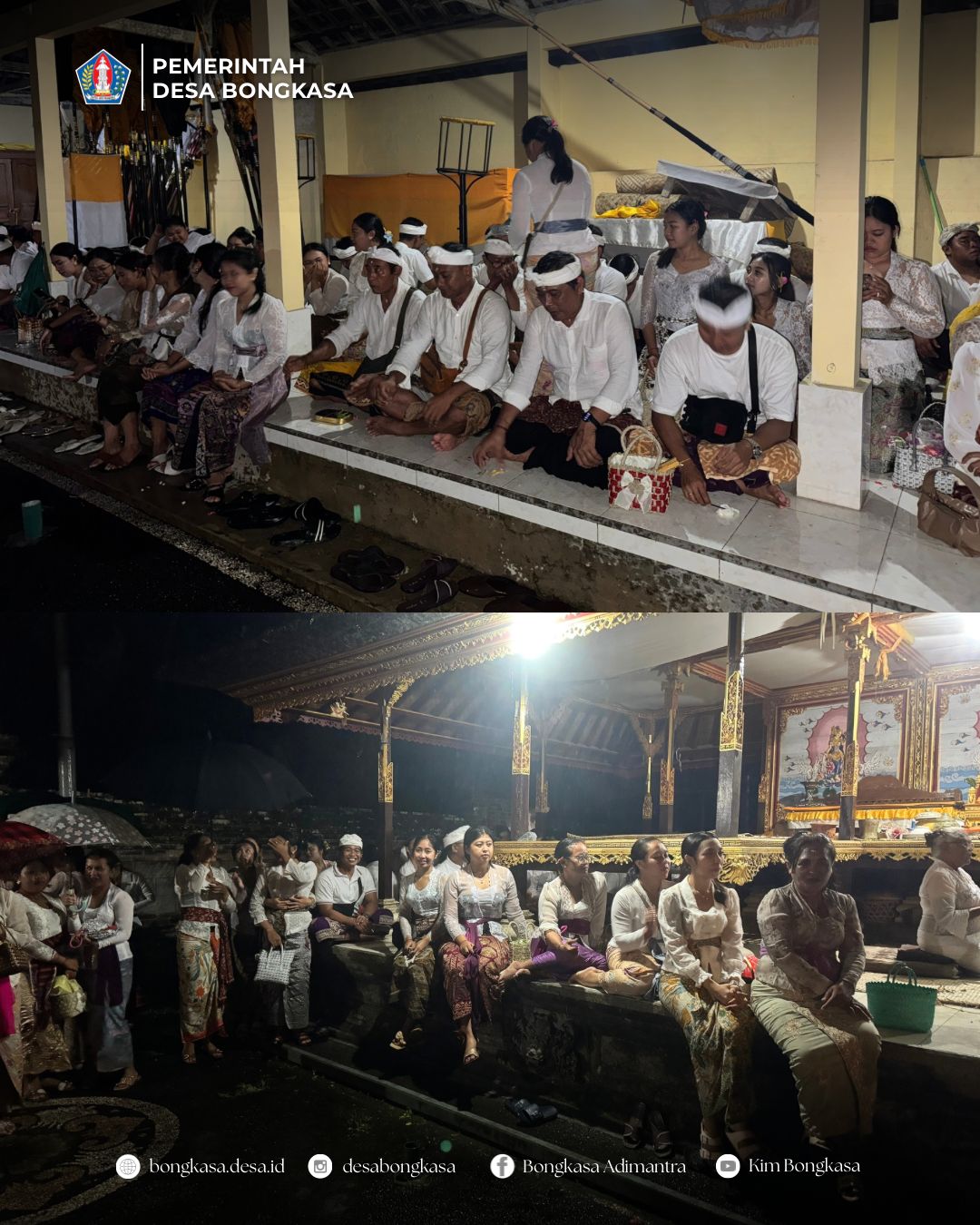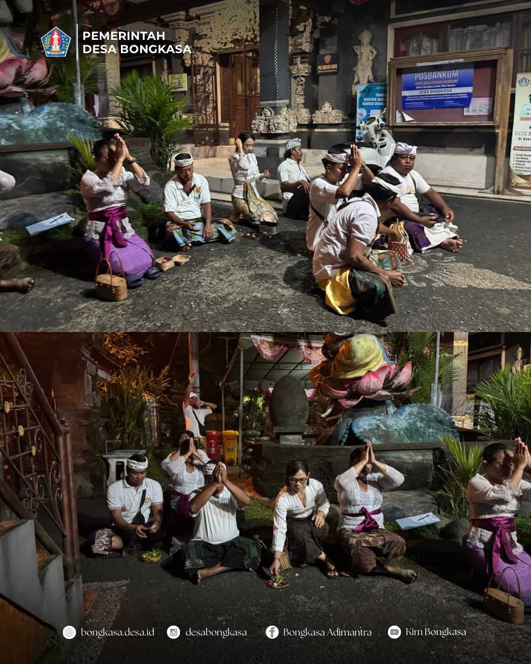 Pemerintah Desa Bongkasa pada Sabtu, 17 Januari 2026 melaksanakan kegiatan persembahyangan bersama di Pelinggih Kantor Desa Bongkasa, Pura Desa lan Puseh Desa Adat Bongkasa, Pura Dalem Gede Desa Adat Bongkasa, Pura Desa lan Puseh Desa Adat Kutaraga, Pura Dalem Gede Desa Adat Kutaraga.