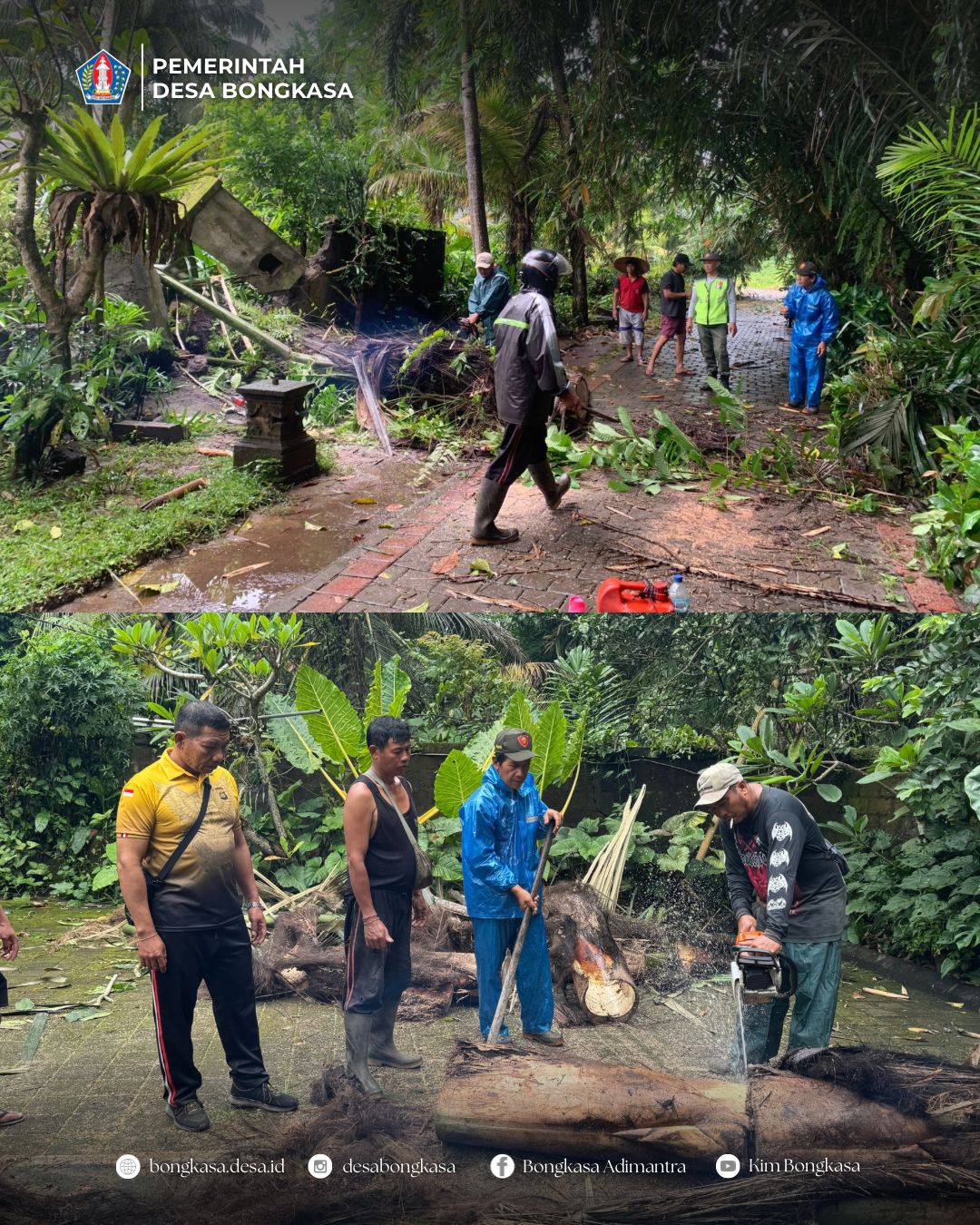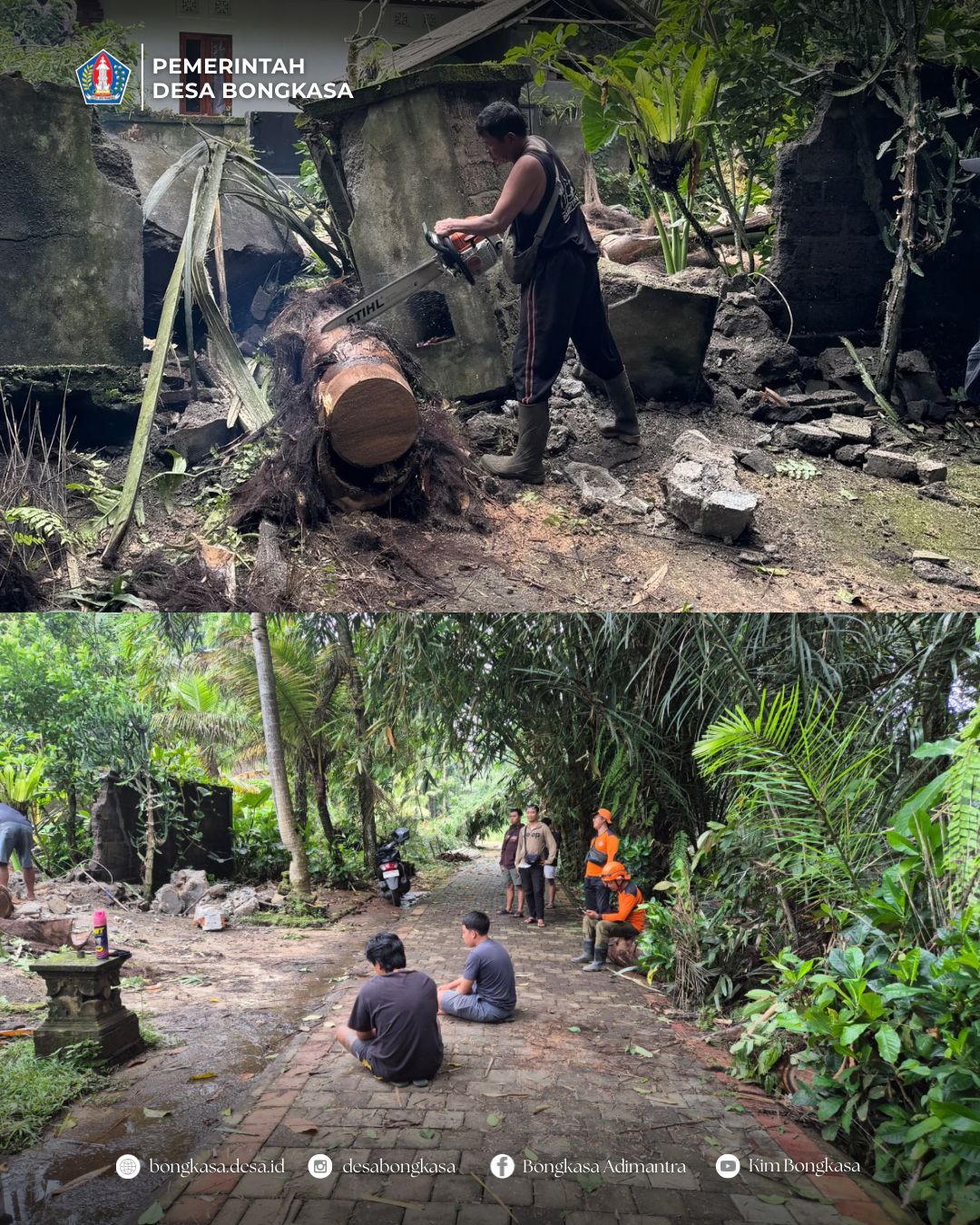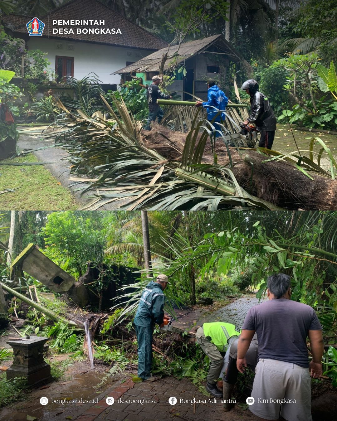 Tim Reaksi Cepat (TRC) Desa Bongkasa melakukan penanganan/pembersihan pohon tumbang (pohon enau/aren) Banjar Pengembungan Sari pada Sabtu, 14 Februari 2026.
