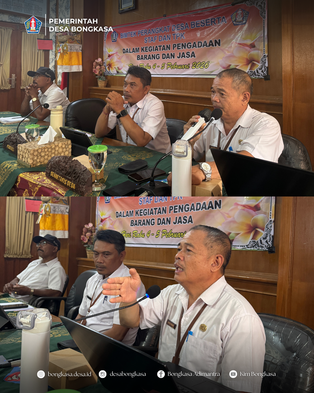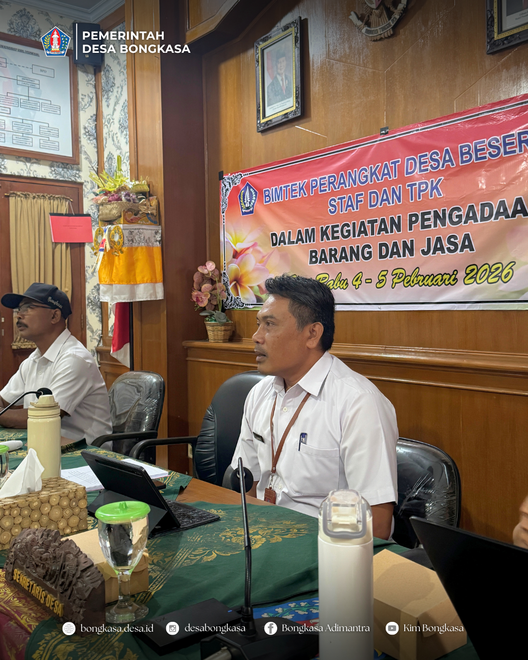 Pemerintah Desa Bongkasa mengadakan Bimbingan Teknis (Bimtek) Pengadaan Barang dan Jasa bertempat di Aula Kantor Desa Bongkasa pada tanggal 4 s.d 5 Februari 2026.