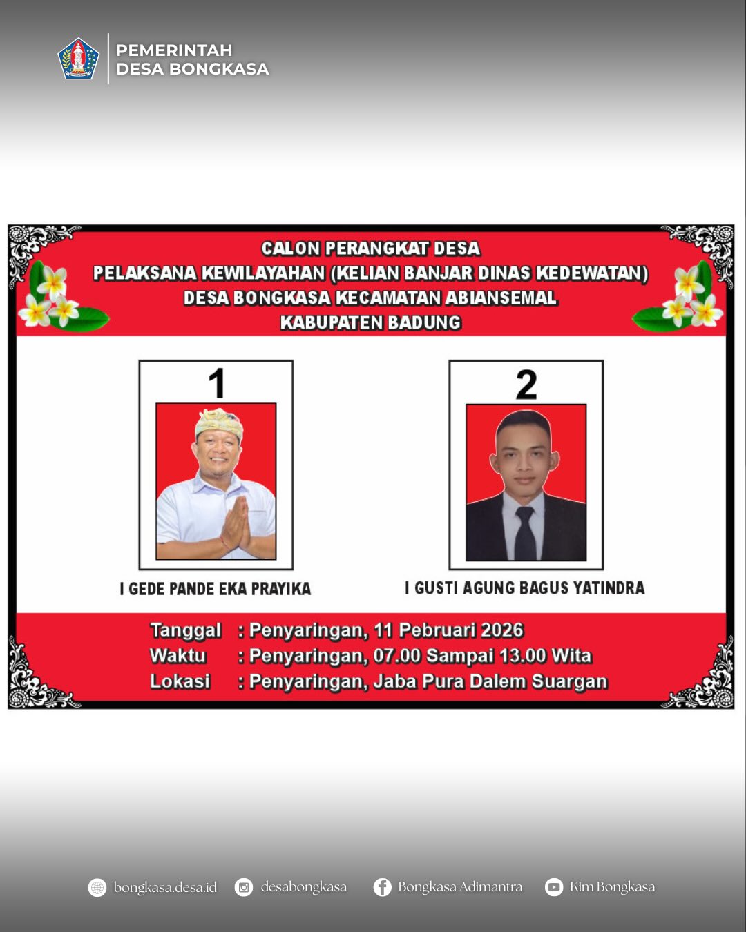 Tim Penjaringan dan Penyaringan Perangkat Desa Pelaksana Kewilayahan Kelian Banjar Dinas Kedewatan pada Sabtu, 7 Februari 2026 melaksanakan Pengundian nomor urut dan penyepakatan foto Calon Perangkat Desa Pelaksana Kewilayahan Kelian Banjar Dinas Kedewatan yang bertempat di Kantor Desa Bongkasa.