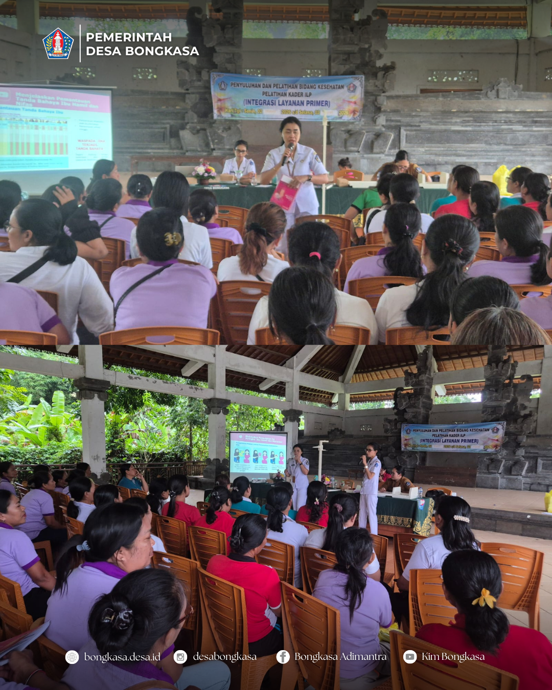Pemerintah Desa Bongkasa melaksanakan kegiatan Penyuluhan dan Pelatihan Bidang Kesehatan dengan mengadakan Pelatihan Kader ILP (Integrasi Layanan Primer) pada Senin, 2 Maret 2026 yang bertempat di Wantilan Pura Desa, Desa Adat Bongkasa.